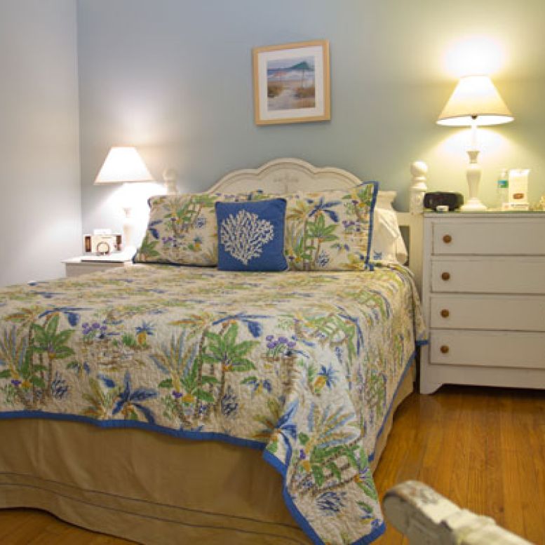 This country themed upstairs room has hardwood floors, a Queen bed, a flat screen television and a private bathroom with a walk in shower.